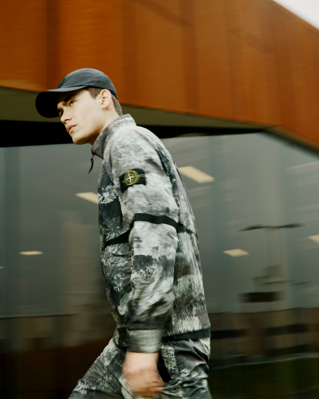A young man wearing a black cap and a camo jacket walking past a blurred background of modern buildings.